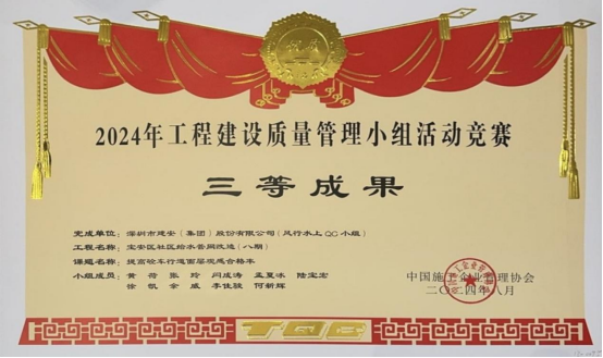 2024年8月13日至16日,机电安装工程公司荣幸地参加了由中国施工企业协会主办的2024年(第二届)工程建设行业群众性质量活动高质量发展大会。此次大会上,公司重点分享了宝安区社区给水管网改造(八期)工程的质量活动优秀成果,并荣获了国家级三等奖的崇高荣誉。