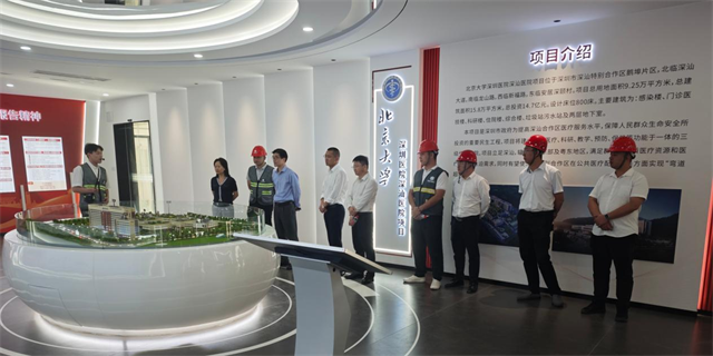 调研团队首先抵达智慧展厅,通过视频演示和沙盘展示,全面了解了北大医院项目的整体概况、项目亮点以及周期策划等内容。北大医院项目部配备了高精尖的智能设备和专业的人才团队,通过BIM全过程管理来提升施工效率和质量,旨在打造粤东地区集教学、研究、临床、医养为一体的高质量医学中心。
