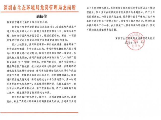 生态环境局龙岗管理局龙岗所在表扬信中,赞扬了项目团队以高度的环保意识、社会责任感和绿色环保治理能力,积极落实环保主体责任,取得明显成效。龙岗爱联派出所爱联警务室表扬信中对项目在社会稳定与安全保卫方面的卓越表现给予了肯定。