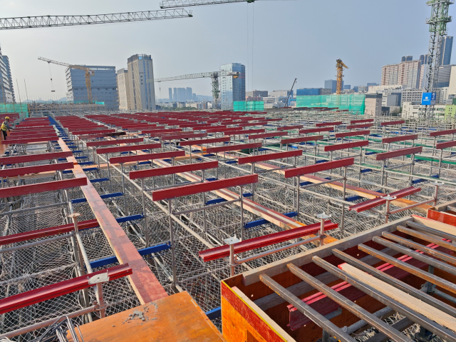 创新创优,科技赋能。项目秉持“技术先行、样本引路”的管理理念,采用自重轻且强度高的M60重型盘扣体系,以及“多功能U型可调顶托+齿槽梁结构”等专利产品,成功攻克梁板共用模数不匹配的支模难题,借助建筑信息模型提前解决机电安装问题,运用预制化施工方法缩短泵房安装周期,实现机电安装工程质量和效率“双丰收”。同时设置样板展示区,统一质量标准,有效避免在大规模施工中出现返工及工期延误情况,推动项目建设提质增效。履约过程中,项目荣获一体化水性耐磨固化地面施工技术研究与应用科技成果评价证书、公司级第三届工程建设质量管理小组活动大赛三等奖。