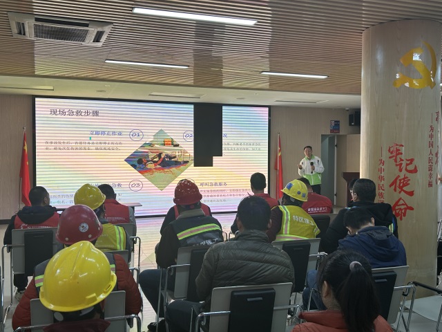 建筑工程一公司党支部联合小梅沙社区党群服务中心在小梅沙集散中心项目部开展了“工友健康行,共筑幸福家”志愿服务活动,为工友们送去饮用水、凉茶、毛巾、藿香正气胶囊等清凉解暑物资。还邀请了小梅沙社区健康服务站的医生为全体工友及志愿者带来了一场干货满满的健康知识讲座。医生结合建筑行业的工作特点,针对日常施工中可能遇到的突发状况,详细介绍了应急处理办法。从伤口的简单包扎、中暑的紧急应对,到骨折的初步固定等,通过理论讲解、现场示范、互动问答等方式,让大家能够更直观地理解和掌握应急知识,提高个人应急处理能力。