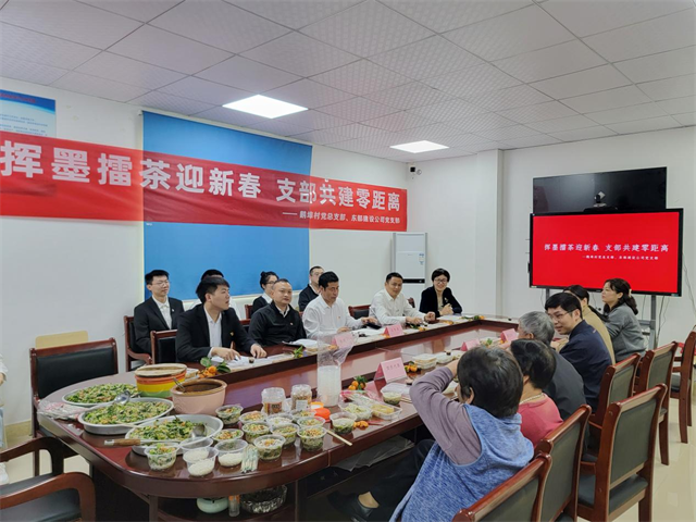 茶话会上,施滨彬对东部建设党支部的到来表示欢迎,并详细向与会人员介绍了鹅埠村的发展历史、村容村貌、未来发展方向等内容。东部建设党支部书记巨军昌对鹅埠村取得如此良好的发展成果表示祝贺,并表示自2021年双方构建“资源共享、双向服务、双向共赢”的党建合作新格局以来,大大提升了基层党建工作成效。未来东部建设党支部将进一步加强同鹅埠村委的党建联合共建力度。在茶话会的最后,鹅埠村委为与会人员准备了当地特色小吃“擂茶”,大家共同品尝后,纷纷赞不绝口。